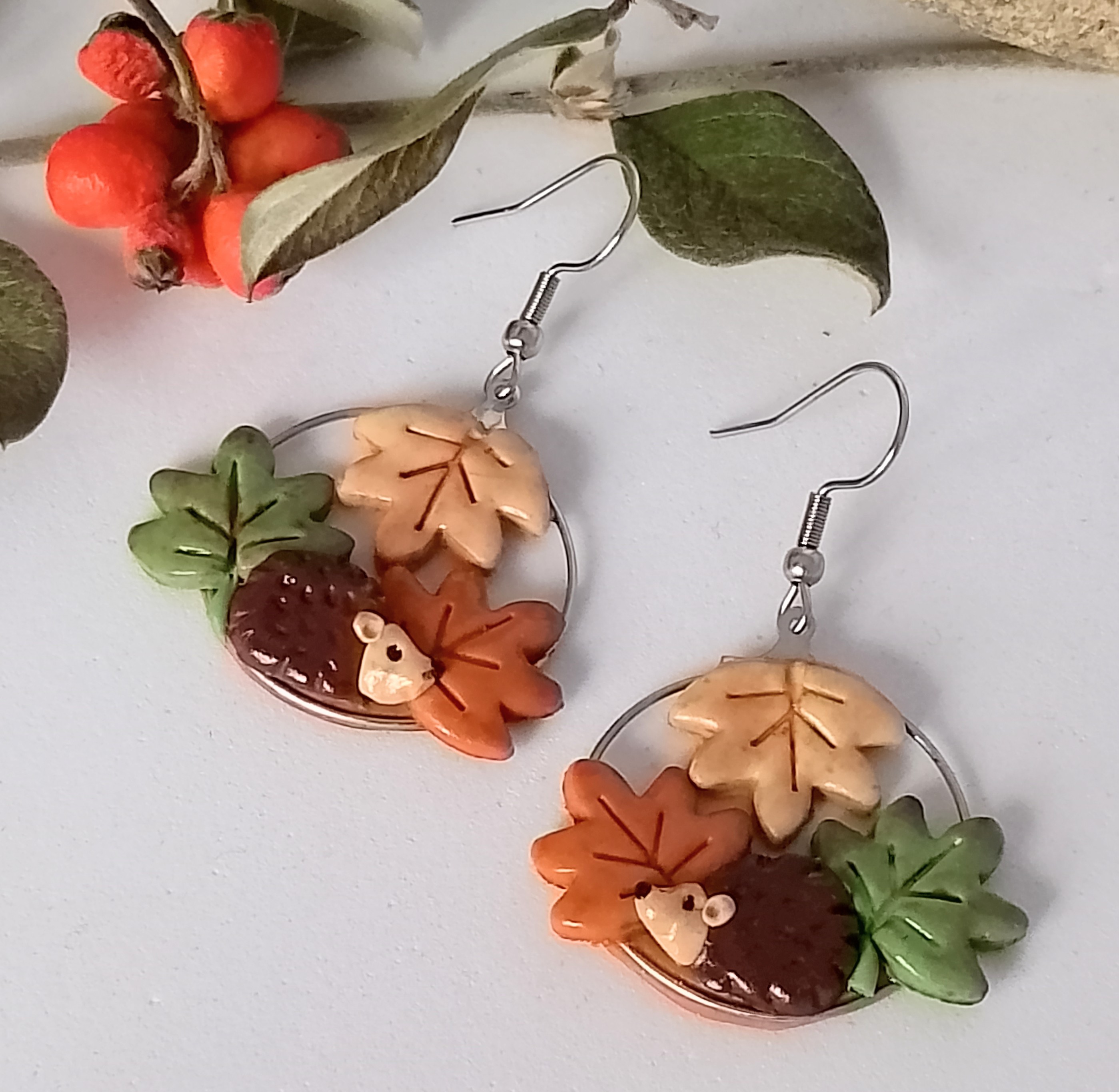 Boucles d'oreilles automnales, petits hérissons et feuilles aux couleurs de saison.