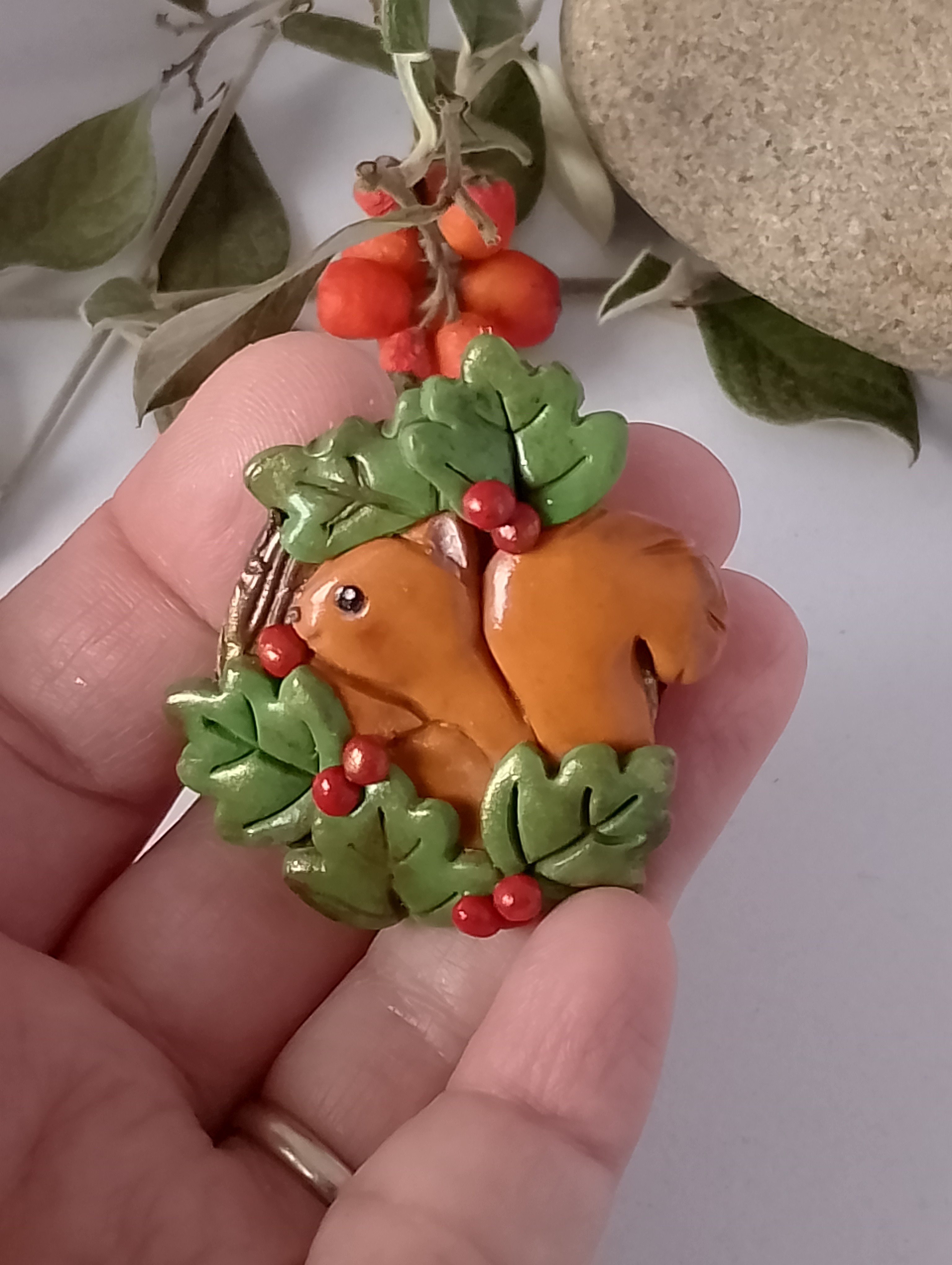 Broche pour l'automne, écureuil, feuille et baies aux couleurs de saison.