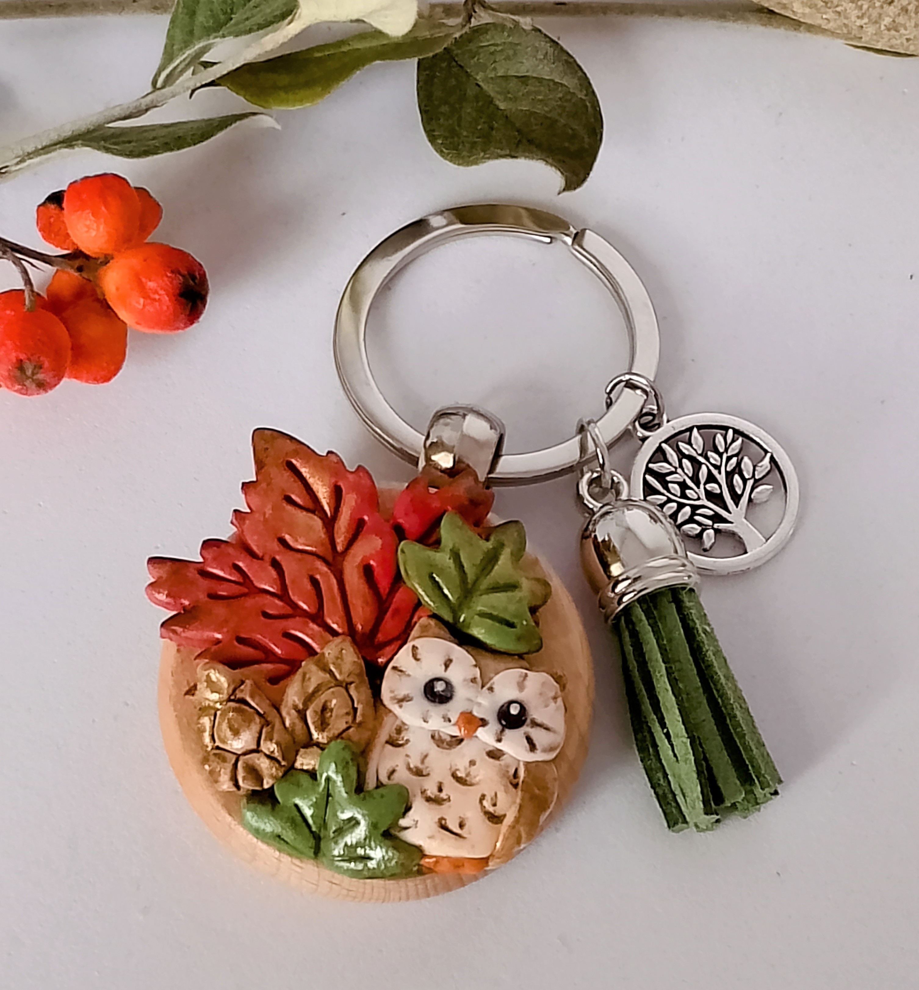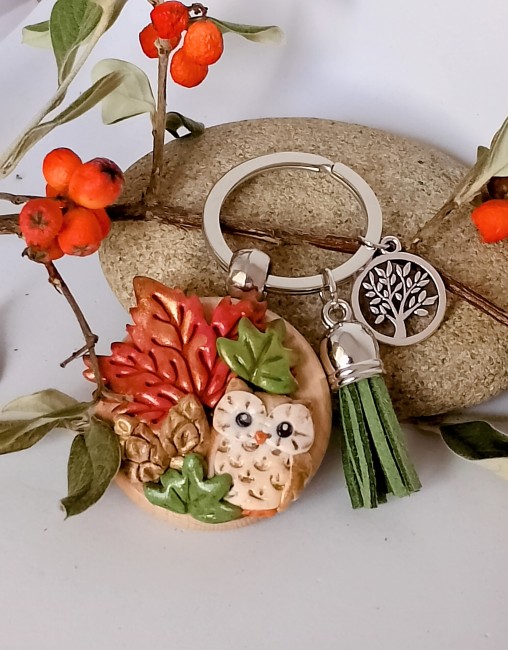 Bijou de sac, chouette en forêt. Réalisation artisanale en argile polymère.