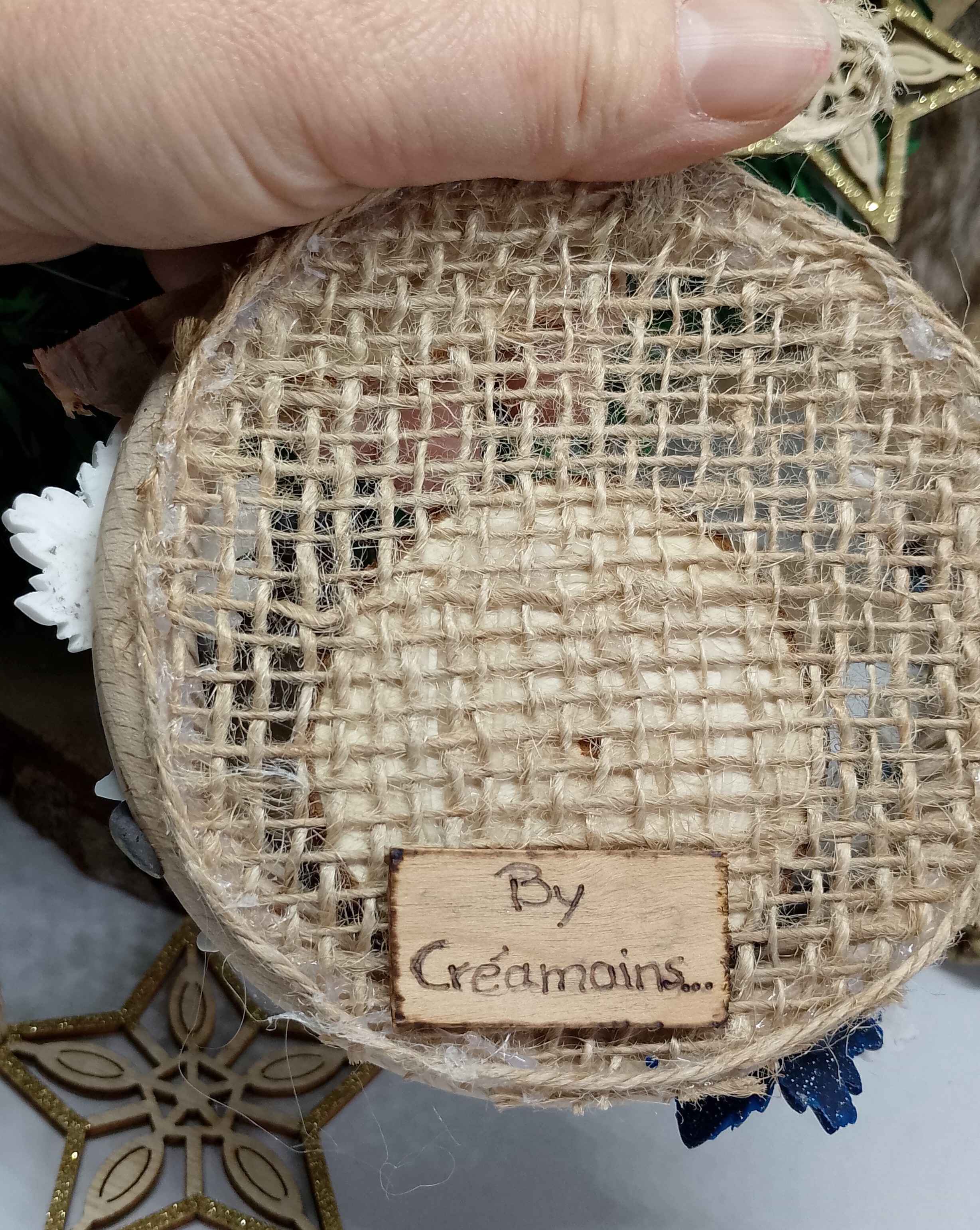 La pancarte texte "bienvenue" et la signature au dos dont réalisés en pyrogravure.