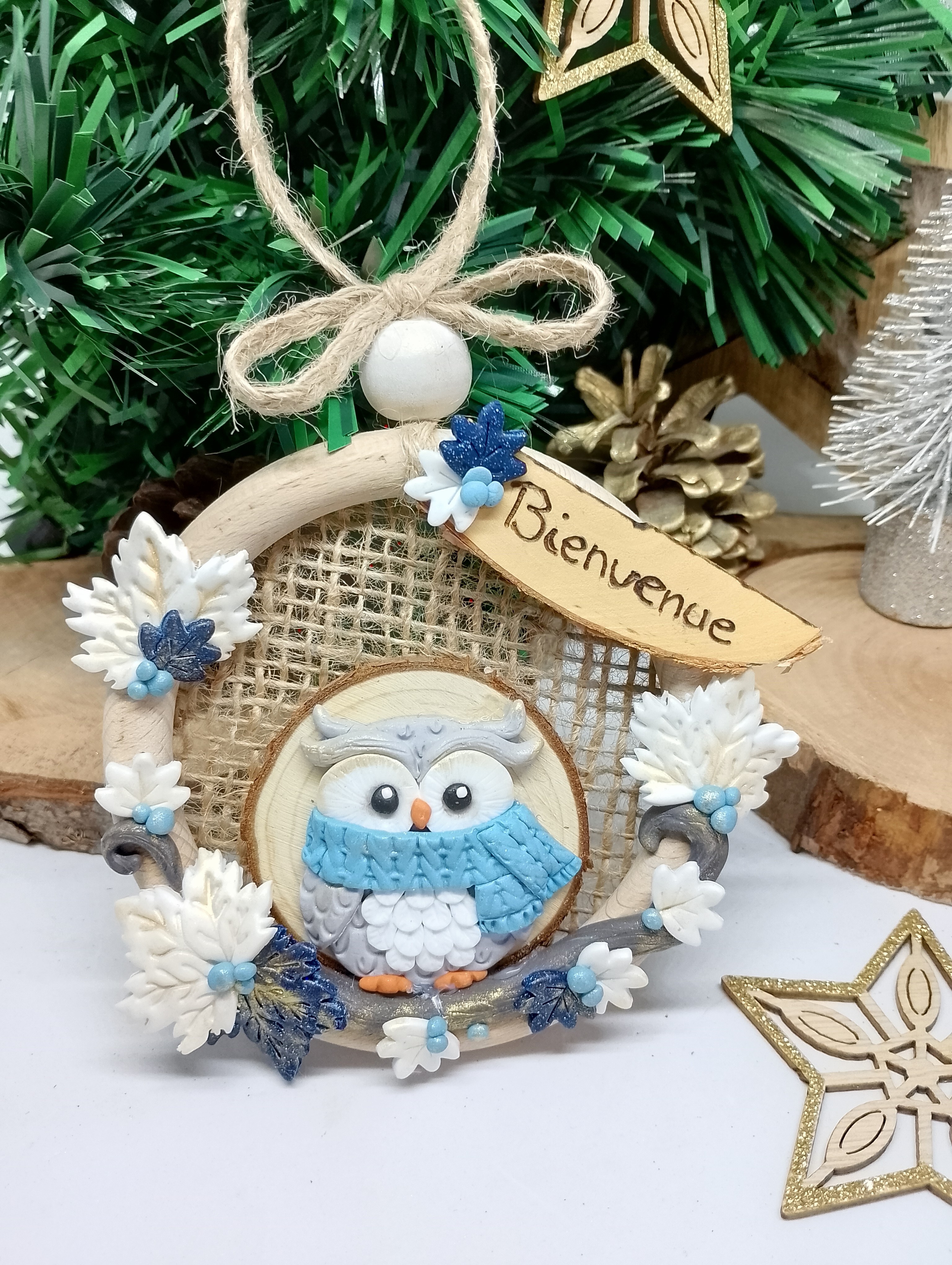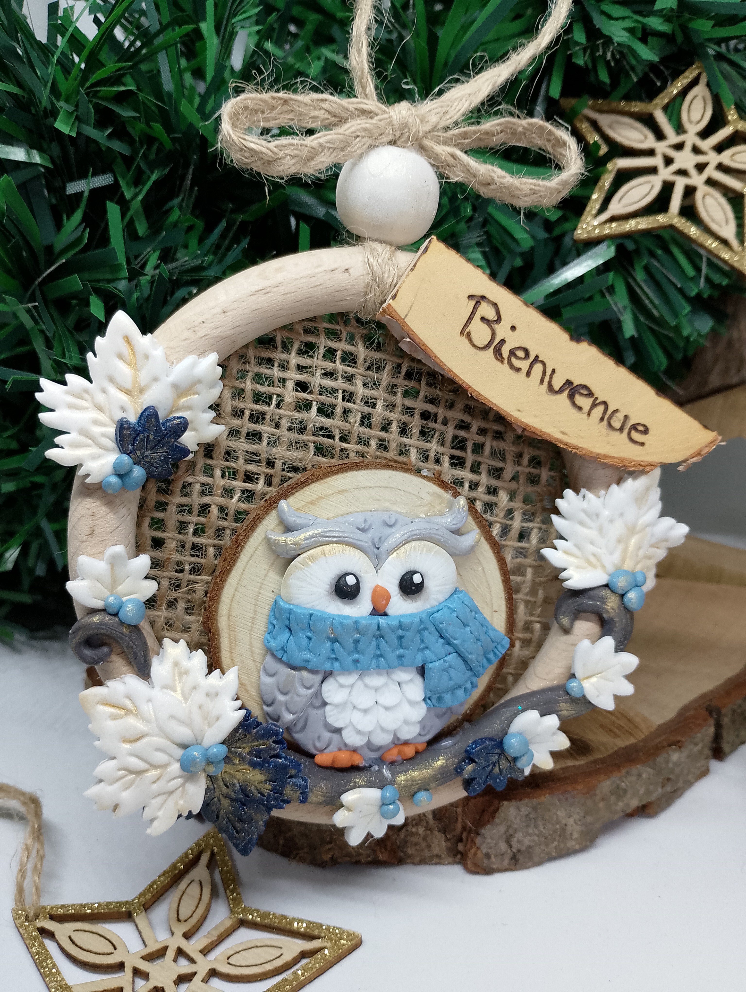 orné d'une chouette et de décorations feuilles, réalisés à la main en argile polymère, avec une touche de poudre dorée.