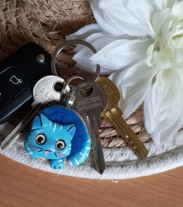 Bijou de sac chat, collection Pompon-Minets bleu, réalisé à la main en argile polymère.