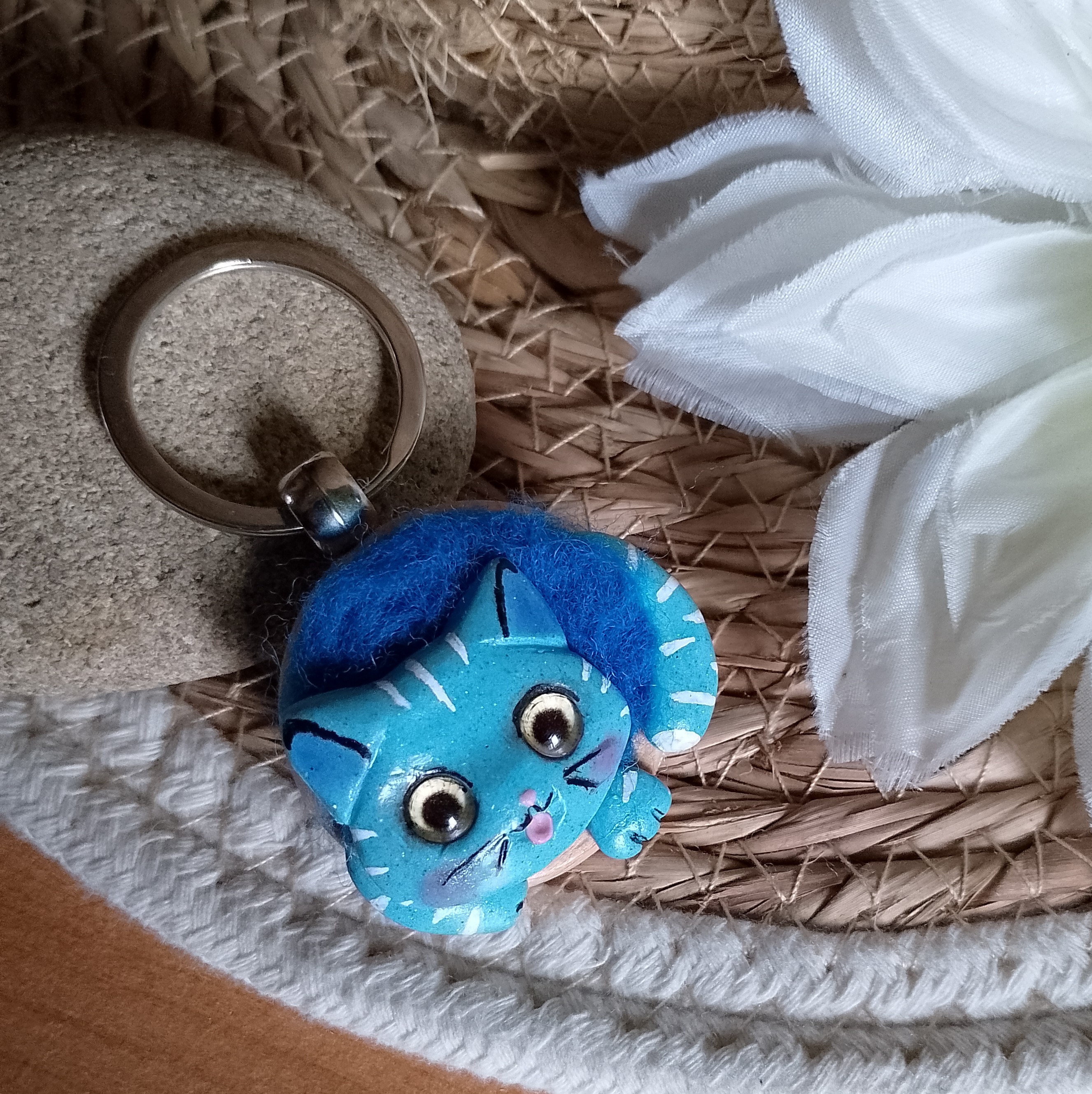 Ce petit chat malicieux, aux grands yeux étincelants, allie la finesse de l’argile polymère et la douceur de la laine pour un effet de texture original et chaleureux.