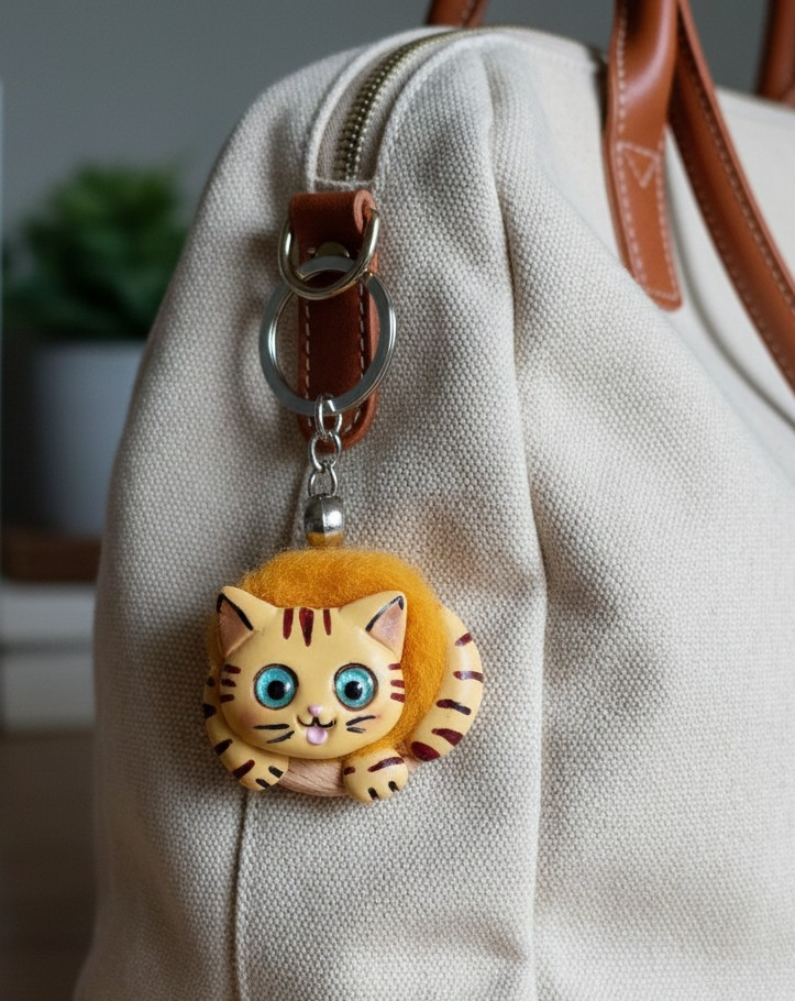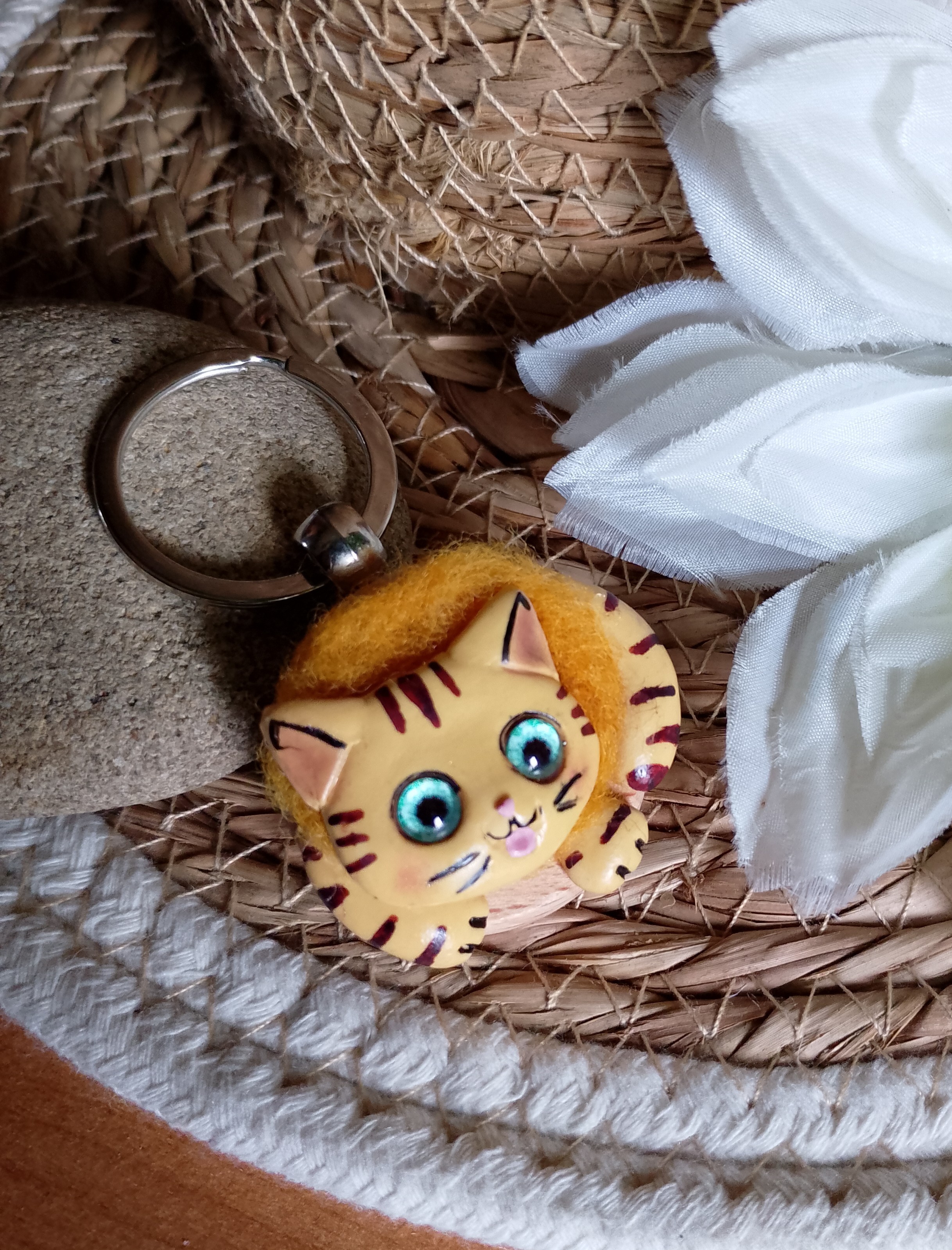 Ce petit chat malicieux, aux grands yeux étincelants, allie la finesse de l’argile polymère et la douceur de la laine pour un effet de texture original et chaleureux.