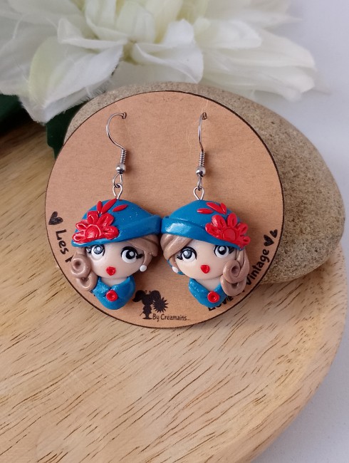 Boucles d'oreilles Poupettes rétro vintage collection Éléonore rouge et bleue, réalisées à la main en argile polymère.Bo Poupettes