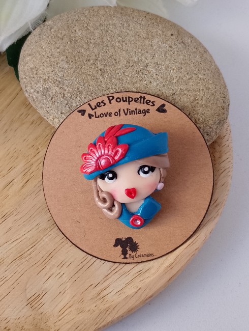 Broche Poupette retro vintage, collection Églantine rose et bleue, réalisée à la main en argile polymère.Broches Poupettes