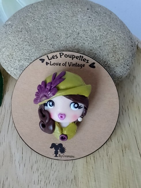 Broche Poupette retro vintage, collection Capucine verte pastel et violette, réalisée à la main en argile polymère.Broches Poupettes
